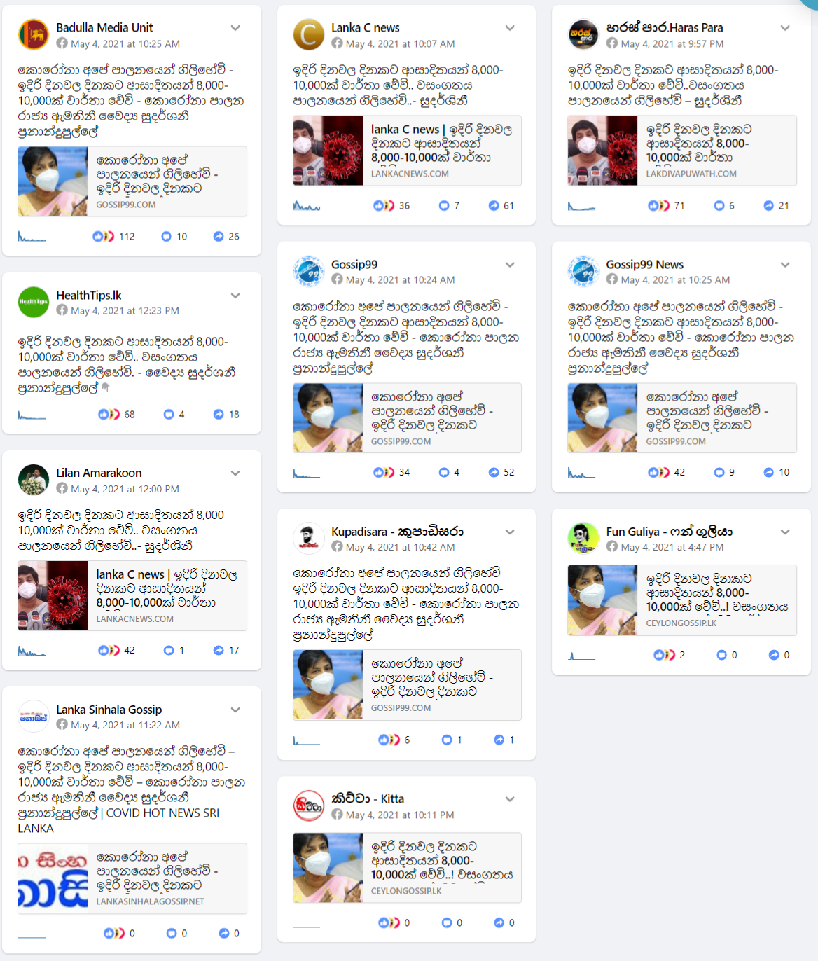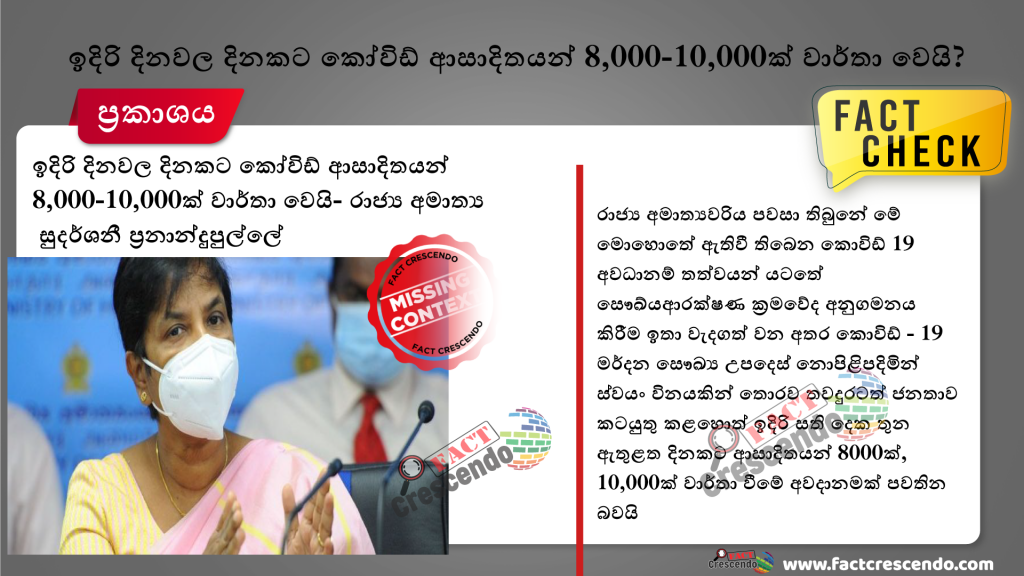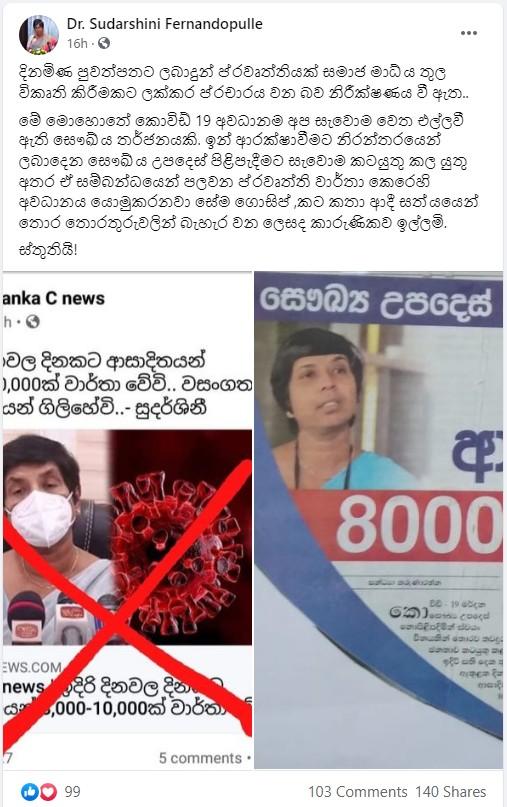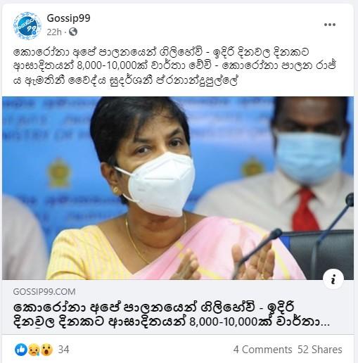 “කොරෝනා අපේ පාලනයෙන් ගිලිහේවි – ඉදිරි දිනවල දිනකට ආසාදිතයන් 8,000-10,000ක් වාර්තා වේවි” යනුවෙන් කොරෝනා පාලන රාජ්ය ඇමතිනී වෛද්ය සුදර්ශනී ප්රනාන්දුපුල්ලේ පැවසූ බවට Gossip99 ෆේස්බුක් පිටුව සඳහන් කර තිබුණා.