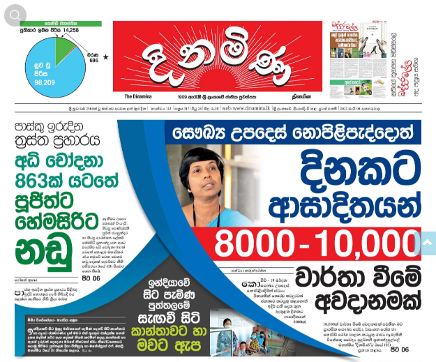 “සෞඛ්ය උපදෙස් නොපිළිපැද්දොත් දිනකට ආසාදිතයන් 8000-10,000 වාර්තා වීමේ අවදානමක්” යනුවෙන් සඳහන් ශීර්ෂ පාඨය දිනමිණ පුවත්පතේ මුල් පිටුවේ පළ වී තිබුණේ රාජ්ය ඇමතිනී වෛද්ය සුදර්ශනී ප්රනාන්දුපුල්ලේගේ ඡායාරූපයක් සහිතවයි. එම පුවත් පිටුව පහතින් දක්වා තිබේ.
