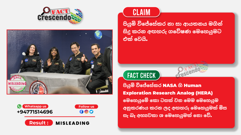 පියුමි විජේසේකර මහත්මිය නාසා ආයතනය අඟහරු වෙත මෙහෙයුමකට යන බවට කරන ප්රකාශය නොමඟ යවන සුළුය වේ. පියුමි විජේසේකර, ජේසන් ලී, ස්ටෙෆනි නවරෝ සහ ෂරීෆ් අල් රොමයිති සමගින් NASA හි Human Exploration Research Analog (HERA) මෙහෙයුමේ කොටසක් වන මෙම මෙහෙයුම අනුකරණය කරන ලද අඟහරු මෙහෙයුමක් මිස සැබෑ අභ්යවකාශ මෙහෙයුමක් නොවේ. HERA හි අරමුණ වන්නේ දිගුකාලීන අභ්යවකාශ මෙහෙයුම් වලදී ගගනගාමීන් අත්විඳින දේට සමාන හුදකලාව, සිරවී සහ දුරස්ථ තත්වයන්ට කාර් ය මණ්ඩල සාමාජිකයින් අනුගත වන ආකාරය අධ්යයනය කිරීමකි.