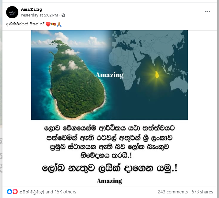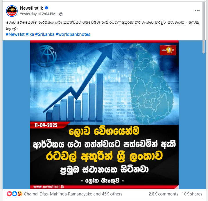 “ලොව වේගයෙන් ම ආර්ථිකය යථා තත්ත්වයට පත්වෙමින් ඇති රටවල් අතුරින් ශ්රී ලංකාව ප්රමුඛ ස්ථානයක – ලෝක බැංකුව” යනුවෙන් සඳහන් කරමින් සමාජ මාධ්ය ඔස්සේ සටහනක් සංසරණය වී තිබුණා.