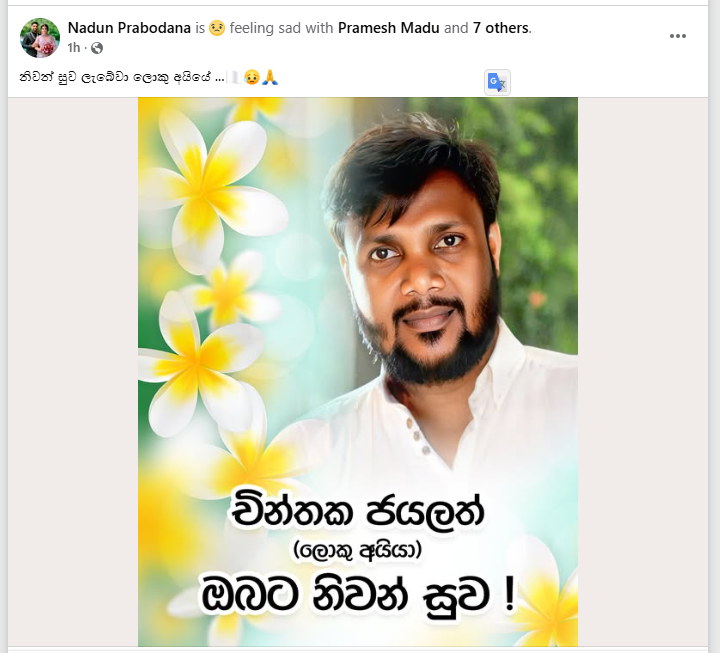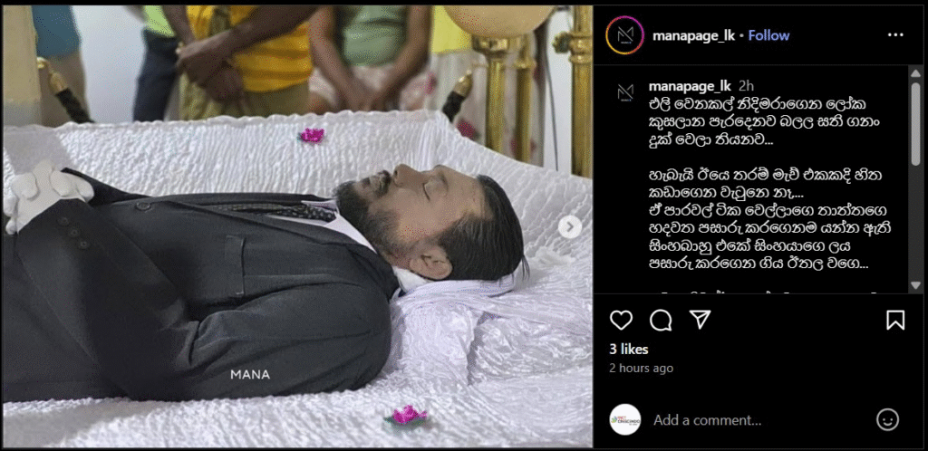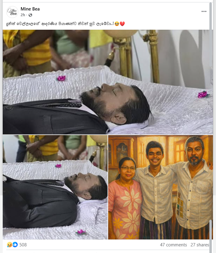 ක්රිකට් ක්රීඩක දුනිත් වෙල්ලාලගේ පියාගේ මෘත දේහය බවට දක්වමින් සමාජ මාධ්ය ඔස්සේ ඡායාරූපයක් සංසරණය වී තිබුණේ මේ අයුරින්.