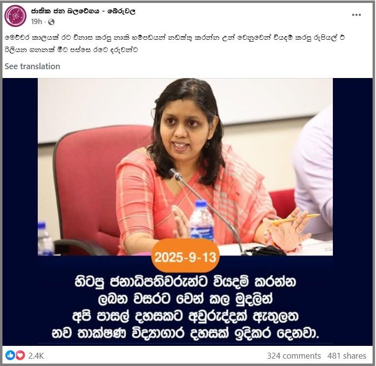 මේ අතර සමාජ මාධ්ය ඔස්සේ සංසරණය වන සටහන සම්බන්ධව අප පාර්ලිමේන්තු මන්ත්රී ලක්මාලි හේමචන්ද්ර මෙනවියගෙන් ද විමසා සිටියා. මන්ත්රීවරිය පැවසුවේ, හිටපු ජනාධිපතිවරුන්ට වියදම් කරන්න ලබන වසරට වෙන් කළ මුදලින් අපි පාසල් දහසකට අවුරුද්දක් ඇතුළත නව තාක්ෂණ විද්යාගාර දහසක් ඉදිකර දෙන බවට වන ප්රකාශයක් තමන් විසින් කිසිදු අවස්ථාවකදී සිදු නොකළ බවයි. ඒ අනුව, සමාජ මාධ්ය ඔස්සේ සංසරණය වන සටහන, ව්යාජ සටහනක් බව මන්ත්රීවරිය ද වැඩිදුරටත් කියා සිටිනවා.
