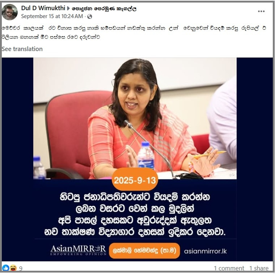 “හිටපු ජනාධිපතිවරුන්ට වියදම් කරන්න ලබන වසරට වෙන් කළ මුදලින් අපි පාසල් දහසකට අවුරුද්දක් ඇතුළත නව තාක්ෂණ විද්යාගාර දහසක් ඉදිකර දෙනවා” පාර්ලිමේන්තු මන්ත්රී ලක්මාලි හේමචන්ද්ර මෙනවිය එලෙස පැවසූ බව කියමින් ඉකුත් 13 වැනිදා Asian Mirror හි ලාංඡනය සහිතව පළකරන ලද සටහනක් සමාජ මාධ්ය ඔස්සේ සංසරණය වෙමින් පවතී. බැලූ බැල්මට පෙනී යන්නේ, මෙය Asian Mirror වෙබ් අඩවි නිල ෆේස්බුක් පිටුවේ පළ කරන ලද සටහනක් බවයි. කෙසේ වෙතත් මන්ත්රීවරියගේ මෙම ප්රකාශයට අදාළව වැඩිවිස්තර හෝ ඒ සඳහා වන ප්රවේශයක් හෝ ලබා දී නොමැත.