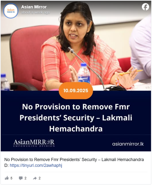එහි සඳහන් කර තිබෙන්නේ No Provision to Remove Fmr Presidents’ Security – Lakmali Hemachandra යනුවෙන් මන්ත්රීවරිය සිදුකරන ලද ප්රකාශයකට අදාළ සටහනකි. ඉකුත් ඔක්තෝබර් 10 වැනිදා එම Asian Mirror හි මෙලෙස පළ කර තිබෙනු දැකගත හැකි විය.