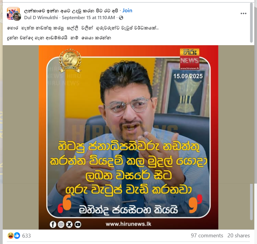 මේ අතර “හිටපු ජනාධිපතිවරු නඩත්තු කරන්න වියදම් කල මුදල් යොදා ලබන වසරේ සිට ගුරු වැටුප් වැඩි කරනවා” යනුවෙන් මහින්ද ජයසිංහ මහතා ප්රකාශයක් කළ බවට දක්වමින් තව ත් සටහනක් සමාජ මාධ්ය ඔස්සේ සංසරණය වූයේ මෙය හිරු පුවත් ඔස්සේ ද, පුවතක් පළ වී ඇති බවට දක්වමින්.