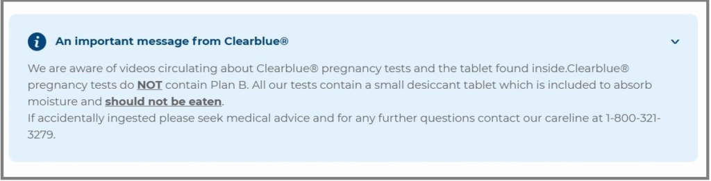 Clearblue ගර්භණීත්ව පරීක්ෂණ කට්ටලවල අන්තර්ගත ද්රව්ය තෙතමනය අවශෝෂණය කර ගැනීම සඳහා වන desiccant එකක් බවත් එය ආහාරයට නොගත යුතු බවත් ය. තවද සමාගම අවධාරණය කර සිටින්නේ, සිය නිෂ්පාදනවල කිසිදු ඖෂධයක් අඩංගු නොවන බවත් එය Plan B හෝ ගැබ් ගැනීම වැළැක්වීමේ හදිසි ඖෂධයක් එහි අන්තර්ගතව නොමැති බවයි.