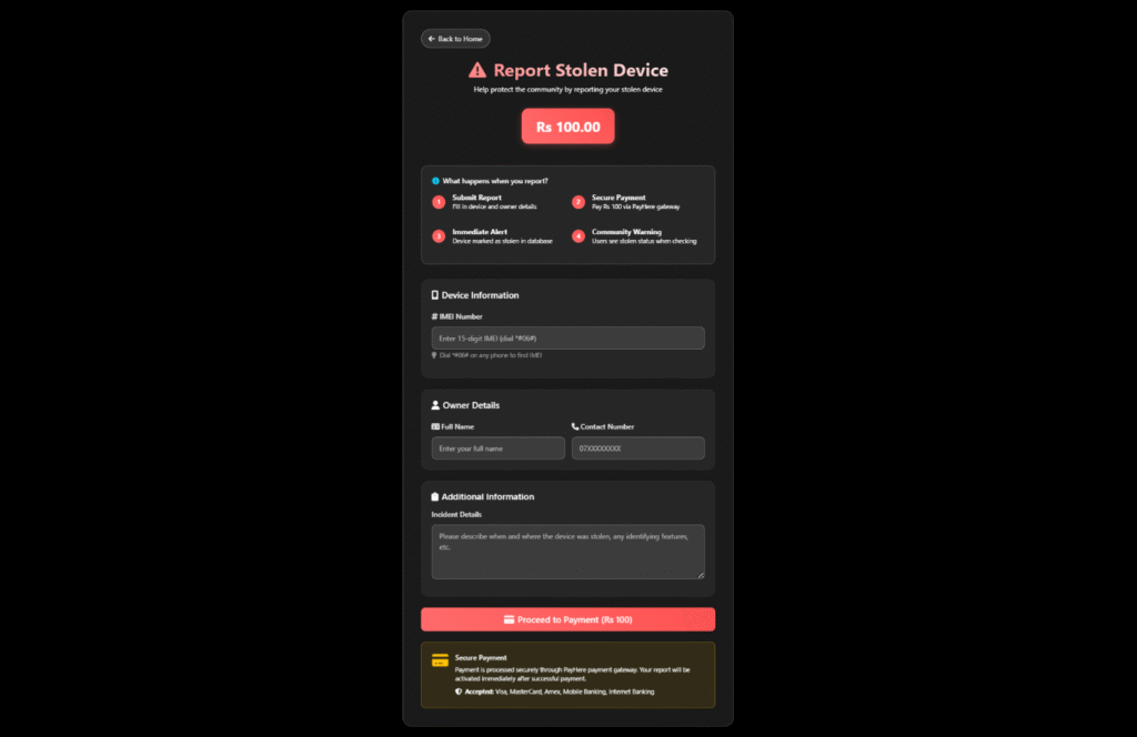 මේ අනුව අප අදාළ FindMobile.lk වෙබ් අඩවිය මගින් ලබාදෙන සේවාවන් පරික්ෂා කළ අතර එහි සේවාවන් ලබාගැනීමට පරිශීලකයින්ට ඔවුන්ගේ IMEI අංකය, සම්පූර්ණ නම, දුරකථන අංකය සහ අදාළ ජංගම දුරකථන නැතිවූ දිනය, ස්ථානය, ඇතුළුව වෙනත් හඳුනාගැනීම සඳහා යොදාගත හැකි කෙටි සිදුවීම් විස්තරයක් ඉදිරිපත් කිරීමෙන් “සොරකම් කරන ලද උපාංග රිපෝට් කරන්න” (Report Stolen Device) යනුවෙන් සදහන් කර තිබේ.