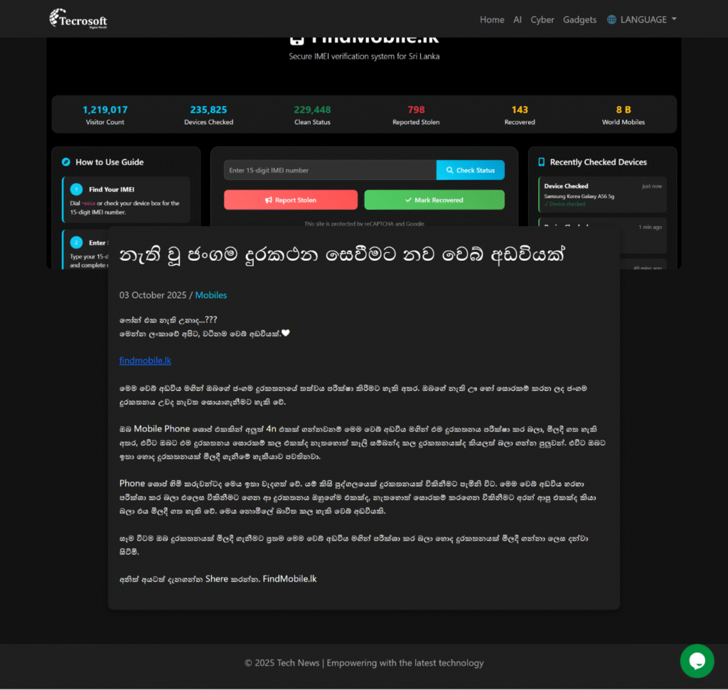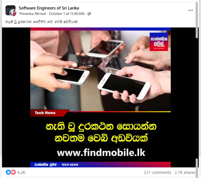 ‘නැති වූ ජංගම දුරකථන සොයන්න නවතම වෙබ් අඩවියක්’ ලෙස findmobile.lk නමැති වෙබ් අඩවියක් පිළිබඳ සඳහන් කරමින් සමාජ මාධ්ය ඔස්සේ සටහනක් පළ වී තිබුණා.