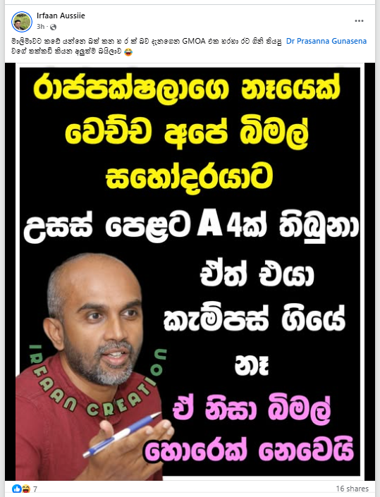 “රාජපක්ෂලාගේ නෑයෙක් වෙච්ච අපේ බිමල් සහෝදරයාට උසස් පෙළට A 4ක් තිබුනා. ඒත් එයා කැම්පස් ගියේ නෑ. ඒ නිසා බිමල් හොරෙක් නෙමෙයි.”යනුවෙන් නියෝජ්ය අමාත්ය ප්රසන්න ගුණසේන විසින් ප්රකාශයක් කළ බවට දක්වමින් සමාජ මාධ්ය ඔස්සේ සටහනක් පළ වී තිබුණේ මෙලෙසින්.