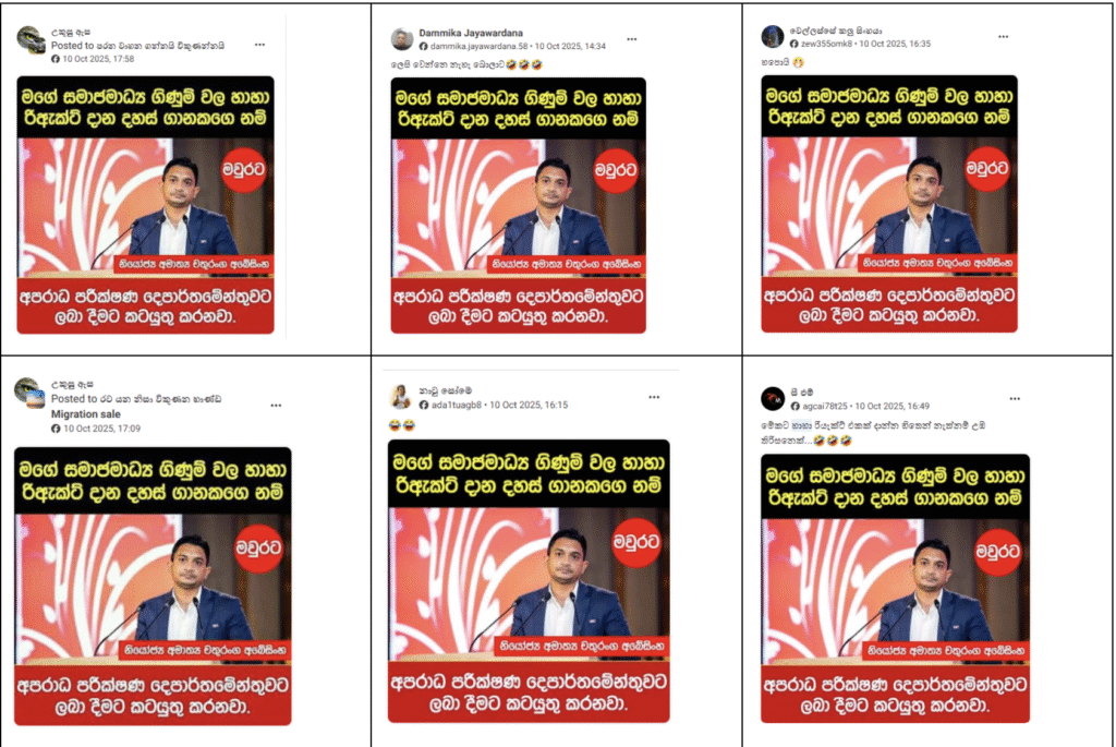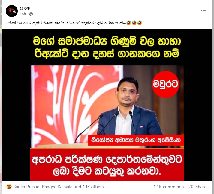 “මගේ සමාජ මාධ්ය ගිණුම් වල හා හා රිඇක්ට් දාන සහස් ගානකගෙ නම් අපරාධ පරීක්ෂණ දෙපාර්තමේන්තුවට ලබා දීමට කටයුතු කරනවා” යනුවෙන් නියෝජ්ය අමාත්ය චතුරංග අබේසිංහ ප්රකාශ කළ බවට දක්වමින් සමාජ මාධ්ය ඔස්සේ සටහනක් සංසරණ වූයේ මෙලෙසින්.