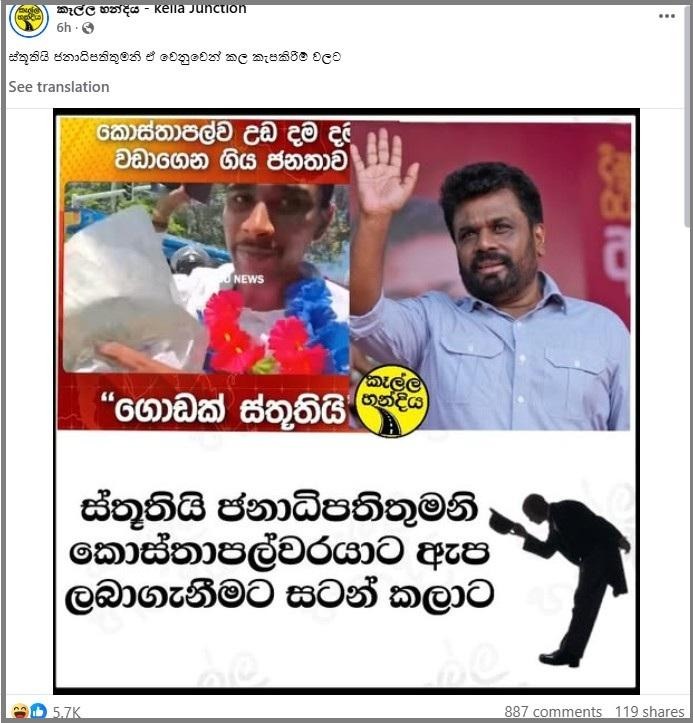 “ස්තුතියි ජනාධිපතිතුමනි කොස්තාපල්වරයාට ඇප ලබා ගැනීමට සටන් කළාට“ යනුවෙන් සඳහන් කරමින් ජනාධිපති අනුර කුමාර දිසානායක මහතා පොලිස් කොස්තාපල්වරයාට ඇප ලබාගැනීමට මැදිහත්වූ බව කියමින් සමාජ මාධ්ය ජාලා ඔස්සේ මෙලෙස සටහනක් සංසරණය වෙමින් තිබේ. මෙම සටහන පළ කර ඇත්තේ, ජනාධිපතිවරායගේ සහ පසුගිය දා ගස්කිස්ස අධිකරණ පරිශ්රයේ සිදුවීමෙන් පසු අත්අඩංගුවට පත්ව ඔක්තෝබර් 13 ඇප හිමිවූ පොලිස් නිලධාරියාගේ ඡායාරූප දෙකක් ද සහිතවයි.
