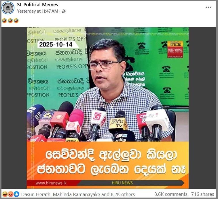 එසේම එම පුවත ඔක්තෝබර් 14 මාධ්ය සාකච්ඡාවක දී සිදුකළ බව ඒත්තු ගන්වමින් පළකර තිබුණ ද එහි ඇතුළත් ඡායාරූපයේ දක්වෙන්නේ ද මීට වසර කිහිපයකට පෙර මාධ්ය වෙත අදහස් දැක්වීමක් බව ද පෙනී යනවා.
