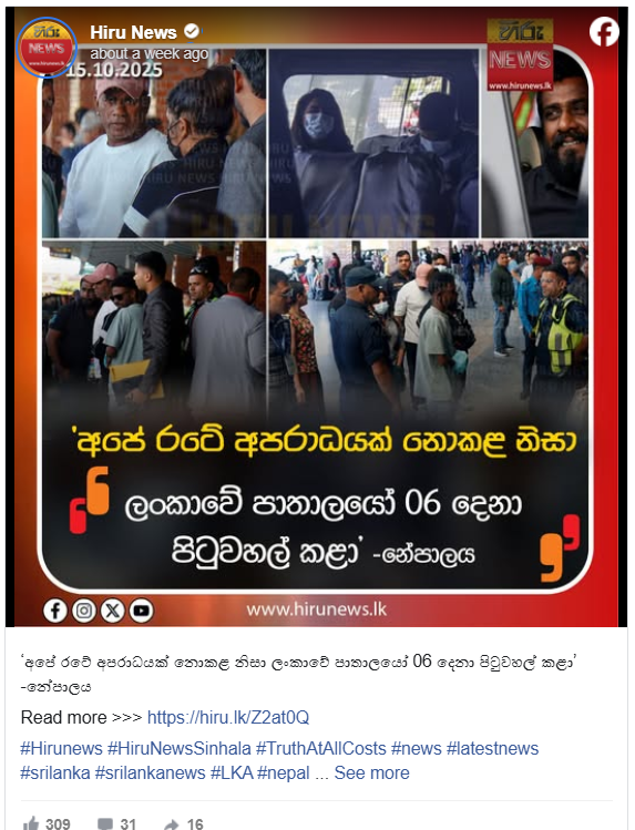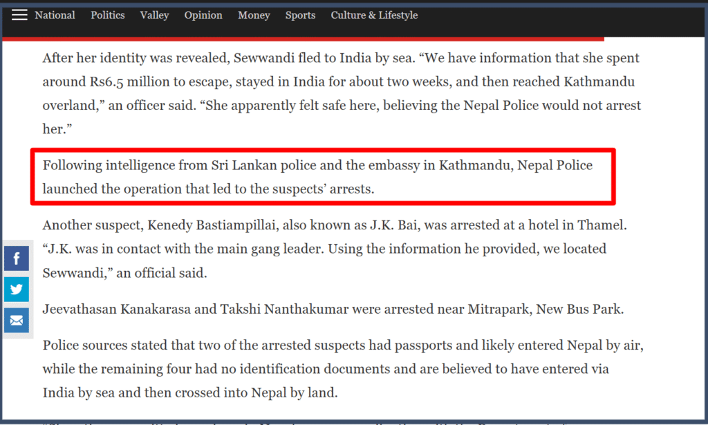 ඒ අනුව, ඉහත සමාජ මාධ්ය ඔස්සේ පෙන්වා දෙන පරිදි නේපාලයේ රජය මෙම අපරාධකරුවන් ඔවුන්ගේ රටේදී වරදක් නොකිරීම මත පිටුවහල් කිරීම සිදු කිරීමෙන් පසු මෙරට පොලිස් නිලධාරීන් ගොස් අපරාධකරුවන් රැගෙන ආ බවට පෙන්වීම නොමග යන ප්රකාශයක් බවට තව දුරටත් පැහැදිලි වේ.