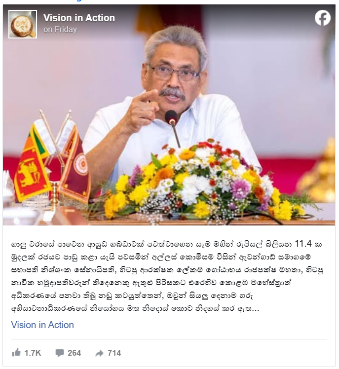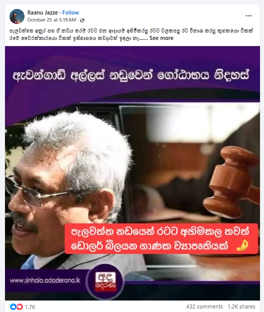 “ගාලු වරායේ පාවෙන ආයුධ ගබඩාවක් පවත්වාගෙන යෑම මගින් රුපියල් බිලියන 11.4 ක මුදලක් රජයට පාඩු කළා යැයි පවසමින් අල්ලස් කොමිසම විසින් ඇවන්ගාඩ් සමාගමේ සභාපති නිශ්ශංක සේනාධිපති, හිටපු ආරක්ෂක ලේකම් ගෝඨාභය රාජපක්ෂ මහතා, හිටපු නාවික හමුදාපතිවරුන් තිදෙනෙකු ඇතුළු පිරිසකට එරෙහිව කොළඹ මහේස්ත්‍රාත් අධිකරණයේ පනවා තිබූ නඩු කටයුත්තෙන්, ඔවුන් සියලු දෙනාම ගරු අභියාචනාධිකරණයේ නියෝගය මත නිදොස් කොට නිදහස් කර ඇත” යනුවෙන් සඳහන් කරමින් සටහනක් සමාජ මාධ්‍ය ඔස්සේ හුවමාරු වී තිබුණේ මෙලෙසින්.