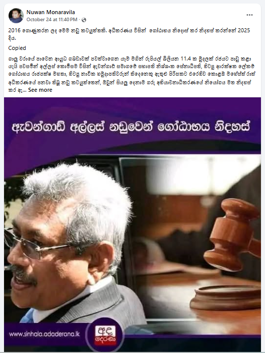 අපගේ විමර්ශනයෙන් පෙන්වා දෙන්නේ, ඇවන්ගාඩ් පාවෙන අවිගබඩා නඩුවෙන් හිටපු ජනපති ගෝඨාභය රාජපක්ෂ සහ නිශ්ශංක සේනාධිපති මෑතක දී නොදොස් කොට නිදහස ලැබූ බව හඟවමින් හුවමාරු වන්නේ නොමග යවන සුළු සටහන් පෙළකි.