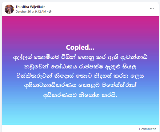 ජාතික ජන බලවේග ආණ්ඩුව යටතේ මෙම තීන්දුව ලබාදුන් බව දක්වමින් පළවූ තවත් සටහනක් පහතින්.