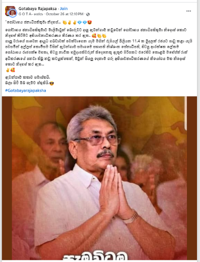 ‘අද දෙරණ’ පුවත් සටහනක් ලෙස දක්වා තිබූ සමාජ මාධ්‍ය සටහන් පරීක්ෂා කිරීමේදී දැක ගන්නට ලැබුණේ, එම සටහන 2019 වසරේ, සැප්තැම්බර් 12 වන දින එහි නිල ෆේස්බුක් පිටුවේ  පළ වී තිබූ පුවතක් බවයි.
