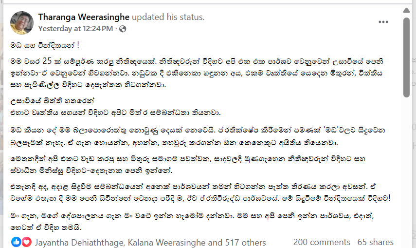 එසේම තමාව ඉලක්ක කරගනිමින් සමාජ මාධ්ය ඔස්සේ වයිරල් වී තිබු මඩ අවලාද සම්බන්ධයෙන් සිය ෆේස්බුක් ගිණුමේ ද නාගරික මන්ත්රීවරයා සටහනක් පළ කර තිබුණේ මෙලෙසින්.