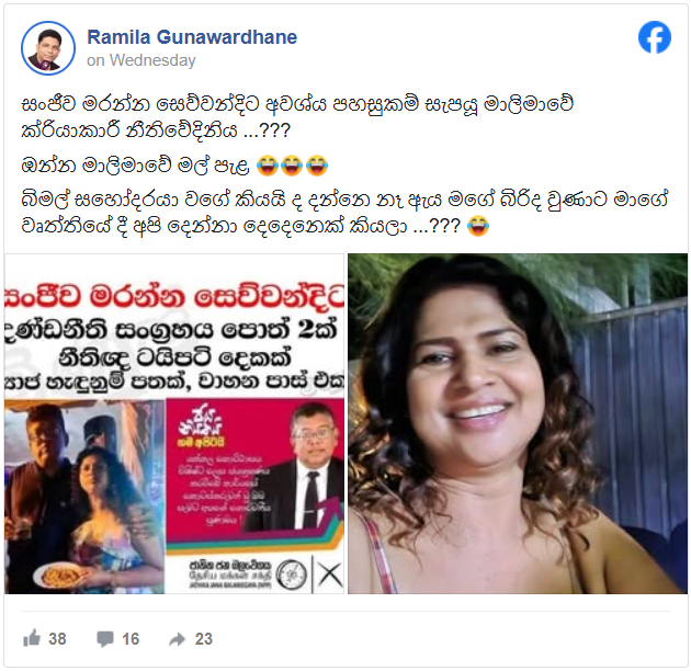 ජාතික ජන බලවේගයේ මාධ්ය සඳහන් කළේ, සමාජ මාධ්ය සටහන් අසත්ය බවත්, මේ සඳහා අත්අඩංගුවට ගෙන ප්රශ්න කරනු ලබන්නේ, ගම්පහ නාගරික මන්ත්රීවරියකගේ බිරිඳක් නොවන බවයි.