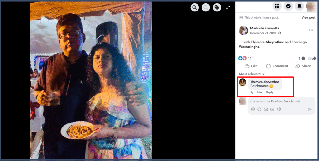 එමෙන් ම එම ඡායාරූපයේ තමරා අබේරත්න නීතිඥවරිය විසින්, මීට වසර පහකට පෙර එක් කරන ලද කමෙන්ටුවක ද සඳහන් කර තිබුණේ, තමා සහ තරංග වීරසිංහ යනු, එකට අධ්යාපනය ලැබූ එකම කණ්ඩායමේ සහෘදයෙකු (batchmate) බවයි.
