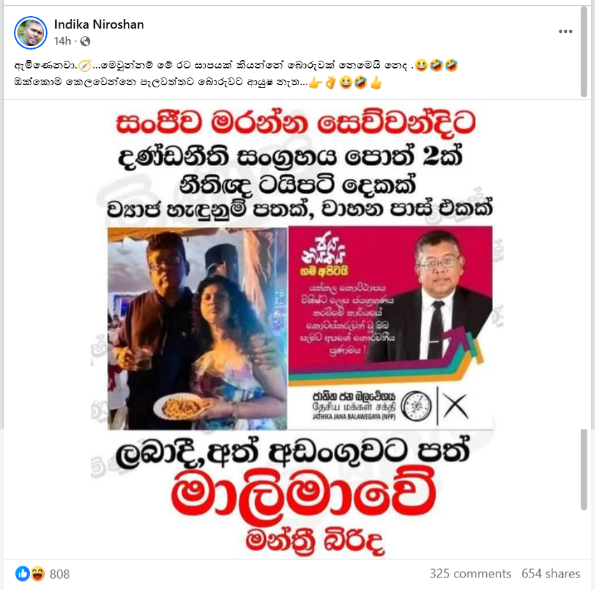 සංජීව මරන්න සෙව්වන්දිට දණ්ඩනීති සංග්රහය පොත් 2ක් නීතිඥ ටයිපටි දෙකක් ව්යාජ හැදුනුම් පතක්, වාහන පාස් එකක් ලබා දී අත්අඩංගුවට පත් මාලිමාවේ මන්ත්රී බිරිඳ ලෙස සඳහන් කළ සමාජ මාධ්ය සටහනක් වූයේ ඡායාරූපයක් ද, සමගයි.