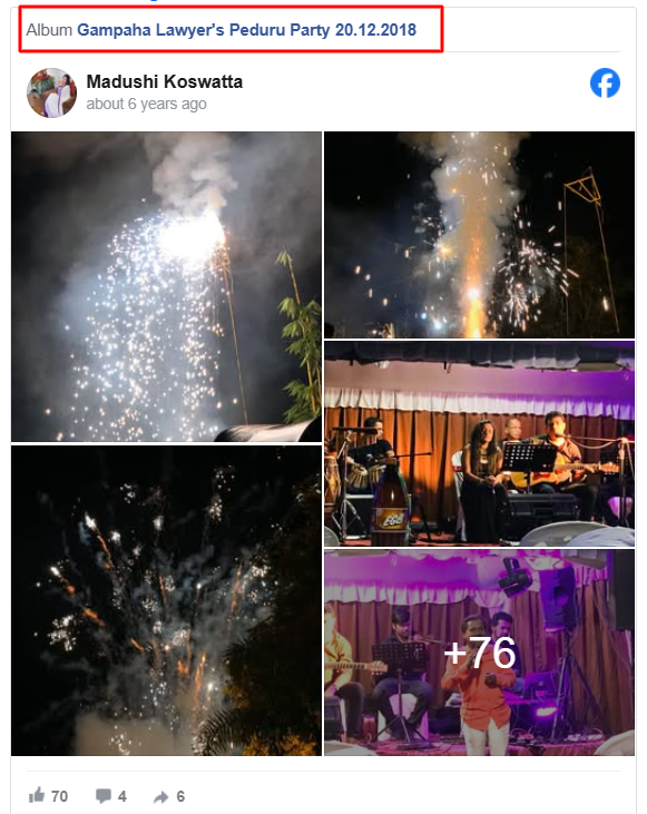 සමාජ මාධ්ය ඔස්සේ පළ වී තිබූ ජාතික ජන බලවේගයේ නීතිඥ තරංග වීරසිංහගේ බිරිඳ තමරා අබේරත්න බවට සඳහන් කර තිබූ ඉහත ඡායාරූපය පිළිබඳව අප පරීක්ෂා කළ අතර එහිදී දැක ගන්නට ලැබුණේ එම ඡායාරූපය 2019 වසරේ දෙසැම්බර් 21 වනදා පළ වී තිබූ 2018 වසරේ ගම්පහ නීතිඥවරුන්ගේ පැදුරු පාටිය යනුවෙන් සඳහන් කළ ඡායාරූප ගොනුවකින් ලබා ගත් ඡායාරූපයක් බවයි.