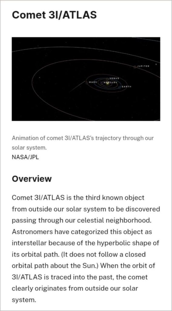 ඒ අනුව සමාජ මාධ්ය තුළ හුවමාරු වන 3I/ATLAS වල්ගා තරුවේ යැයි සැලකෙන වීඩියෝ පටය හෝ එය පිටසක්වල යානාවක් බව දක්වමින් හුවමාරු වන සටහන් නාසා ආයතනය හෝ කිසිදු තාරකා විද්යා පර්යේෂණ ආයතනයක් මගින් පල කරන ලද හෝ තහවුරු කරන ලද ඒවා නොවන බව පැහැදිලි වේ.