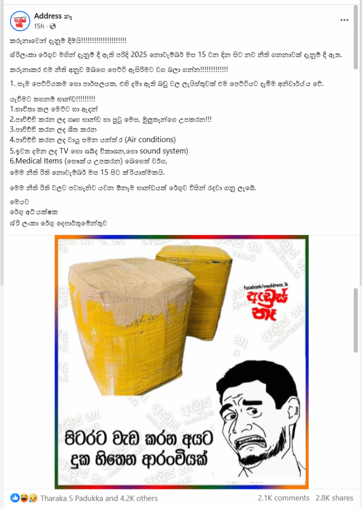 ශ්රී ලංකා රේගුව මගින් දැනුම් දී ඇති පරිදි 2025 නොවැම්බර් මස 15 වන දින සිට නව නීති ගනනාවක් දැනුම් දී ඇති බව ත්, ඒ යටතේ මෙරටට යැවීමට තහනම් භාණ්ඩ ලෙස ලැයිස්තුවක් දක්වා ඇති සමාජ මාධ්ය සටහනක් පළ වී තිබුණේ මේ අයුරින්.