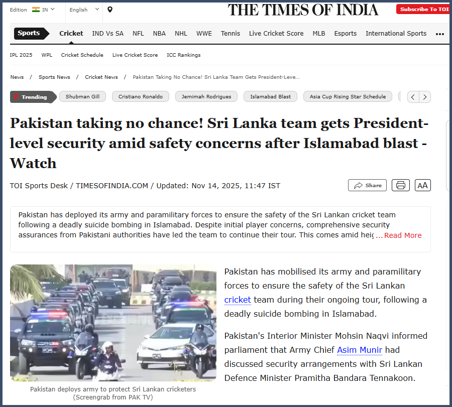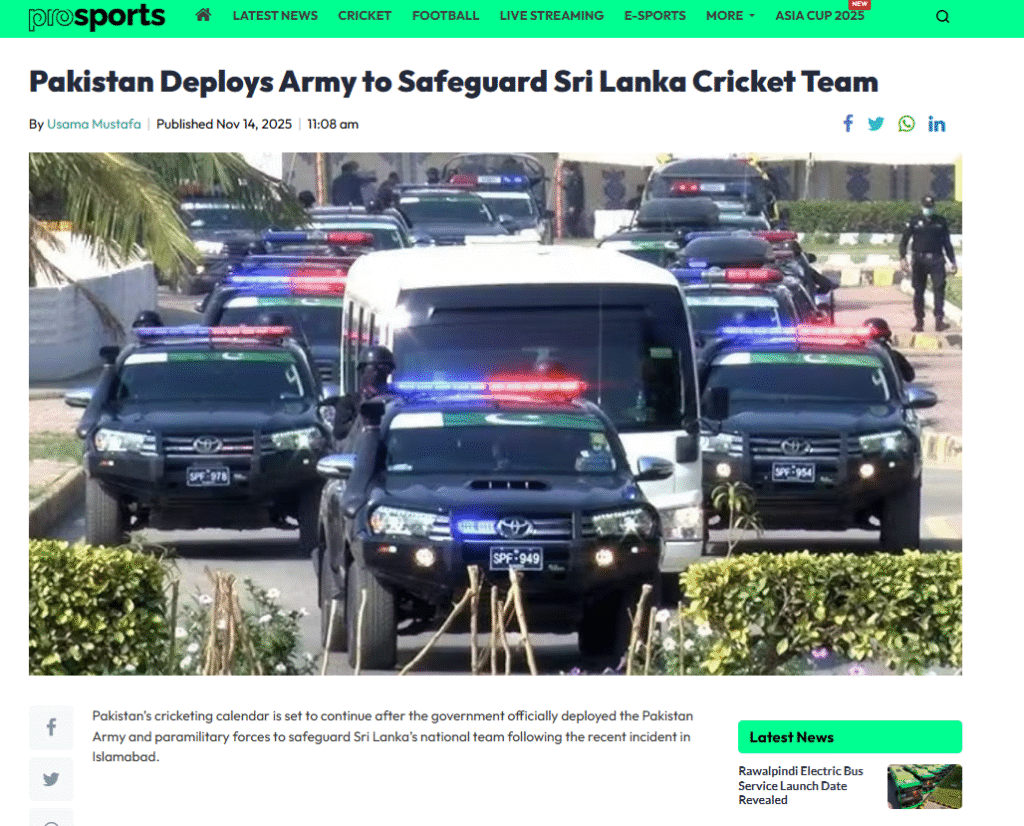 සංචාරක ශ්රී ලංකා කණ්ඩායම සහ පාකිස්ථාන කණ්ඩායම අතර පැවැත්වෙන දෙවන එක්දින ක්රිකට් තරඟය ඊයේ (14) පැවැත්වූ අතර ශ්රී ලංකා ක්රිකට් කණ්ඩායම දැඩි ආරක්ෂක රැකවල් රාවල්පිණ්ඩි ක්රීඩාංගණයට ලබා දී තිබුණා. එම අවස්ථාවේ ලබා දුන් ආරක්ෂාව පිළිබඳ මාධ්ය වාර්තා කර තිබුණේ මේ අයුරිනි.