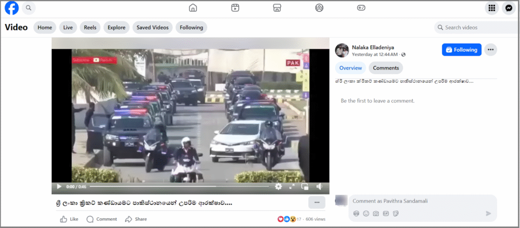 අපගේ විමර්ශනයෙන් පෙන්වා දෙන්නේ, පසුගිය දා එල්ල වූ පාකිස්ථානයට එල්ලවූ මරාගෙන මැරෙන ප්රහාරයකින් පසු පාකිස්ථානයේ ආරක්ෂක අංශ විසින් මෙරට ශ්රී ලංකා ක්රිකට් කණ්ඩායමට ලබා දුන් ඉහළ ආරක්ෂාවක් ලෙසට පෙන්වා දී තිබූ වීඩියෝව 2022 වසරේ වීඩියෝවක් බවයි.