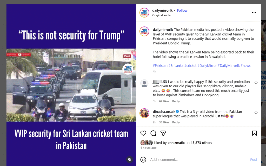 මෙරට ප්රධාන මාධ්ය ධාරා මෙන් ම ජාත්යන්තර මාධ්ය ධාරා වන් ද, ඇතැම් විට කරුණු තහවුරු කර නොගෙන වාර්තා කිරීම තුළින් නොමග යන සුළු සංසරණය වීමට මං පෑදෙනවා. ඒ අයුරුන් පාකිස්ථානය විසින් ශ්රී ලංකා ක්රිකට් කණ්ඩායමට ලබා දුන් ඉහළ ආරක්ෂාවක් ලෙසට පළ වූ වීඩියෝවක් සම්බන්ධයෙන් අප සිදු කළ විමර්ශනයයි මේ.