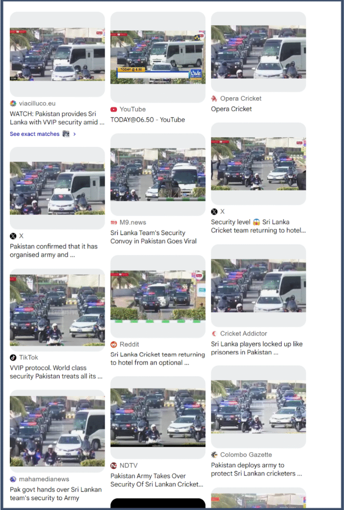 පාකිස්ථාන රජය විසින් මෙරට ක්රිකට් කණ්ඩායමට ලබා දුන් ආරක්ෂාව ලෙස දක්වා තිබූ ඉහත වීඩියෝව පිළිබඳ වෙනත් ජාත්යන්තර මාධ්ය වාර්තා පරීක්ෂා කිරීමේදී මෙම වීඩියෝව පළ කර නොතිබුණු බැවින් අප ඉහත වීඩියෝවේ රූප රාමු Reverse Image සෙවුමක් සඳහා යොමු කරනු ලැබුවා.