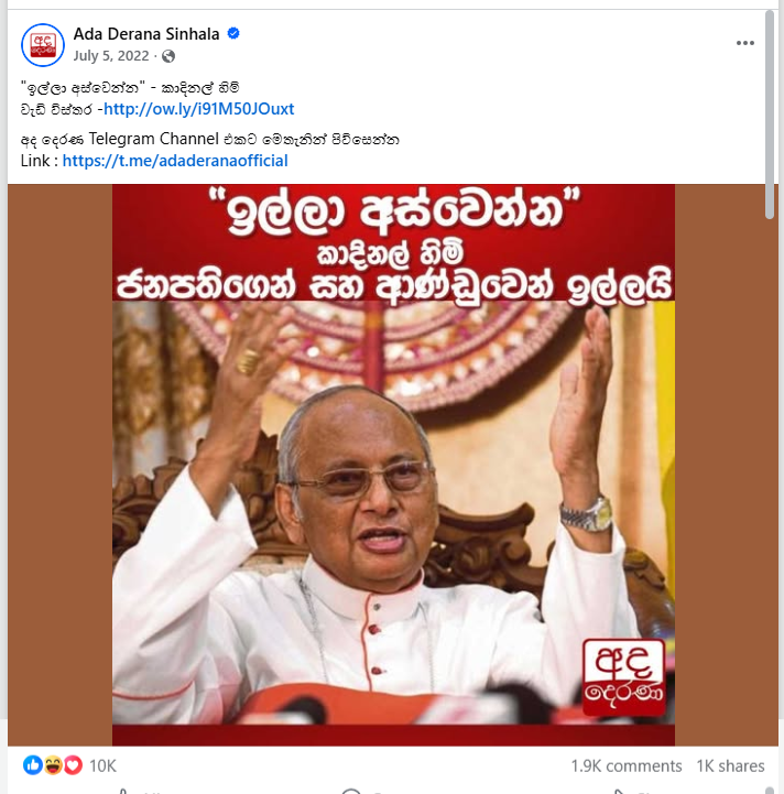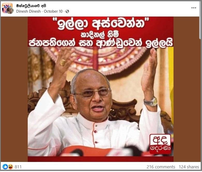 අගරදගුරු අතිඋතුම් මැල්කම් රංජිත් කාදිනල් හිමිපාණන් විසින් ඉල්ලා අස්වෙන ලෙස ආණ්ඩුවෙන් සහ ජනාධිපතිවරයාගෙන් ඉල්ලා ඇති බව කියමින් මෙම ෆේස්බුක් සටහන පළ වී තිබේ. අද දෙරණ පුවත් නිල ලාංඡනය සහිතව පළ කර ඇති කාදිනල් හිමිපාණන් විසින් සිදු කළ බව කියන මෙම ප්රකාශයට අදාළව වැඩිවිස්තර කිසිවක් හෝ විස්තර සඳහා වන සබැඳියක් හෝ මෙම සටහන තුළ දැකගත නොහැක.