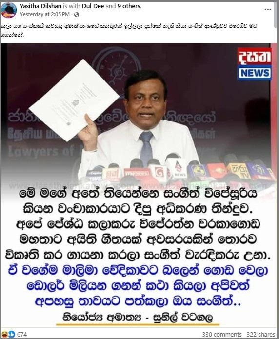 “කලා සහ සංස්කෘති කටයුතු අමාත්යාංශයේ තනතුරක් ඉල්ලලා දුන්නේ නැති නිසා සංගීත් ආණ්ඩුවට එරෙහිව මඩ ගහන්නේ’’ යනුවෙන් සඳහන් කරමින් මෙම සමාජ මාධ්ය සටහන පළ කර ඇත. මහජන ආරක්ෂක නියෝජ්ය අමාත්ය නීතීඥ සුනිල් වටගල මහතාගේ ඡායාරූපයක් ද සහිතව පළ කර ඇති මෙම සටහනේ දැක්වෙන්නේ, ජනප්රිය ගායක සංගීත් විජේසූරිය සම්බන්ධයෙන් නියෝජ්ය අමාත්යවරයා සිදුකළ බව කියන ප්රකාශයකි.