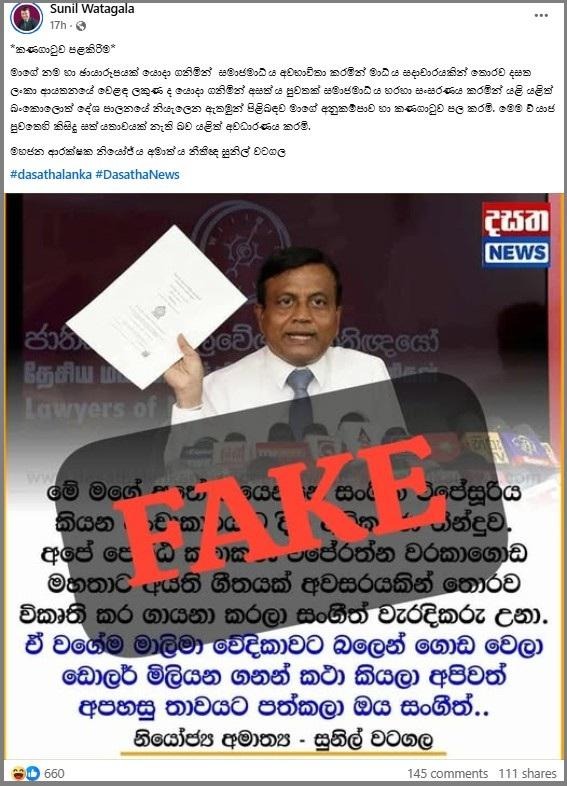 සමාජ මාධ්ය ඔස්සේ සංසරණය වන සටහන සම්බන්ධව අප නියෝජ්ය අමාත්යවරයාගේ මාධ්ය ලේකම්ගෙන් විමසීමක් සිදු කළ අතර නියෝජ්ය අමාත්යවරයා පැවසුවේ, එම සටහන අසත්ය කරුණු ඇතුළත් ව්යාජ සටහනක් බවයි. මේ අතර නියෝජ්ය අමාත්ය සුනිල් වටගල මහතා සිය ෆේස්බුක් පිටුව ඔස්සේ මීට ප්රතිචාර දක්වමින් පවසා ඇත්තේ, සිය නම සහ ඡායාරූපයක් යොදා ගනිමින් දසත ලංකා ආයතනයේ ලාංඡනය ද යොදා ගනිමින් සමාජ මාධ්ය ඔස්සේ සංසරණය වන සටහන අසත්ය පුවතක් බවයි. කනගාටුව පළකිරීම යනුවෙන් නියෝජ්ය අමාත්යවරයා පළ කර තිබූ සටහන මගින් තවදුරටත් අවධාරණය කර තිබුණේ, මෙම ව්යාජ පුවතෙහි කිසිදු සත්යතාවක් නොමැති බවයි.