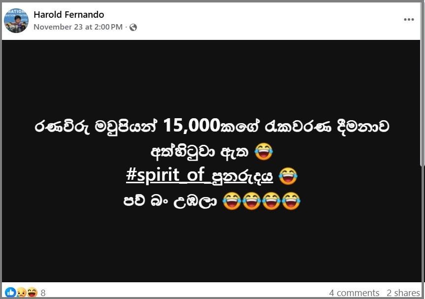 ප්රතිලාභීන් 17,000කට වැඩි ප්රතිලාභීන් පිරිසකගේ රණවිරු මා පිය රැකවරණ දීමනාව අත්හිටුවා ඇති බවට පළ වන සමාජ මාධ්ය සටහන්වල පිළිබඳව අප ආරක්ෂක අමාත්යාංශයේ මාධ්ය අධ්යක්ෂ සහ මාධ්ය ප්රකාශක බ්රිගේඩියර් එස්. ජෝසප් මහතාගෙන් විමසීමක් සිදු කළ අතර මාධ්ය ප්රකාශකවරයා පැවසුවේ, සමාජ මාධ්ය ඔස්සේ සංසරණය වන සටහන් සත්ය නොවන නොමග යවන සුළු සටහන් බව ත්, මෙම දීමනාව ලබා දෙන ක්රමවේදය පිළිබඳ අවබෝධය නොමැතිව ඇතැම් මාධ්ය නොමග යන ලෙසින් වාර්තා කර ඇති බවයි.