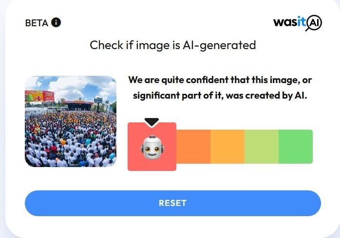 21 රැලියේ ජායාරූපයක් ලෙස හඳුන්වමින් හුවමාරු වූ තවත් ජායාරූපයක් බැලූ බැල්මට දක්නට ඇති අස්වාභාවික බව නිසා අප විසින් එම ජායාරූපය AI (කෘත්‍රිම බුද්ධිය) පරීක්ෂක මෙවලම් කිහිපයක් වෙත යොමු කරමින් එහි සත්‍ය අසත්‍යතාවය පරීක්ෂා කිරීමට අප පියවර ගත්තා.