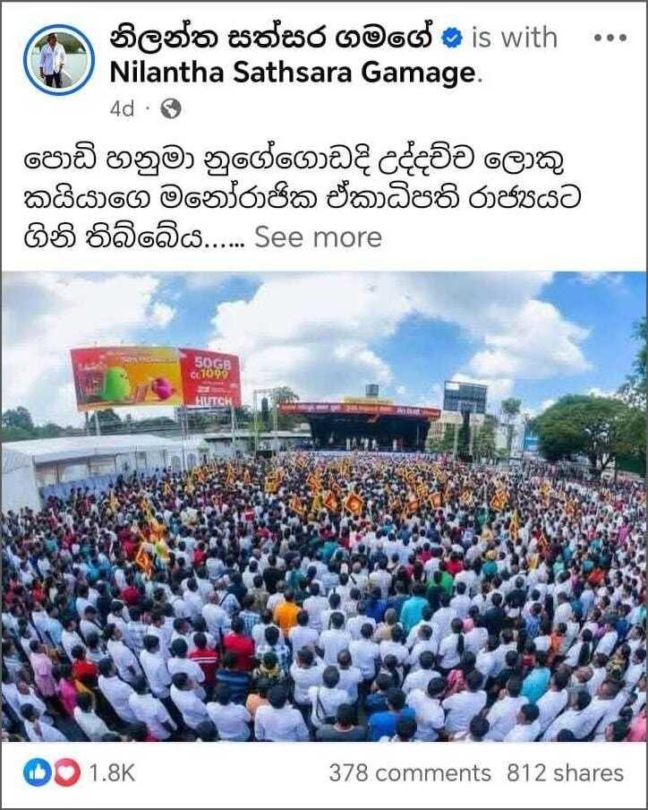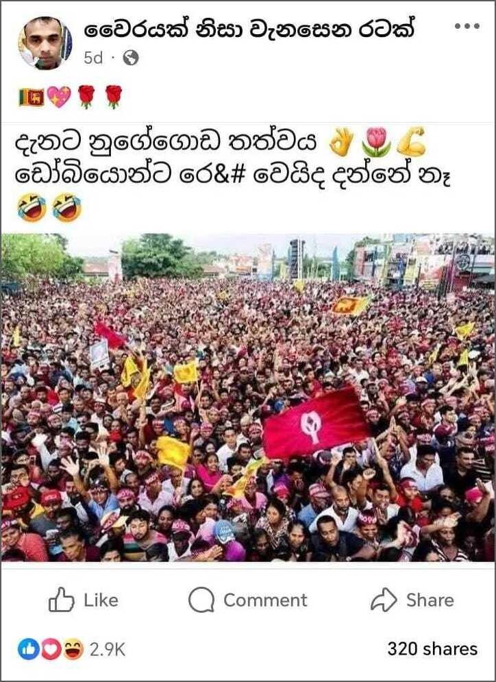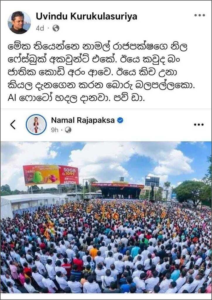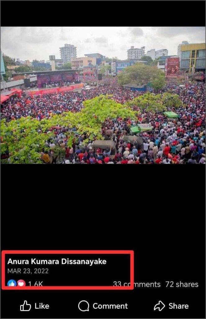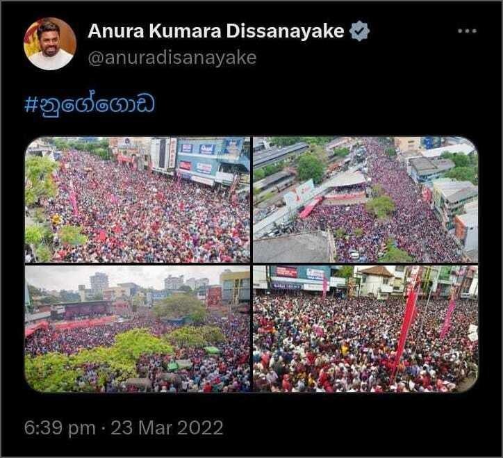 21 රැලියේ ඡායාරූපයක් ලෙසින් හුවමාර වූ තවත් ඡායාරූපයක් Reverse Image හරහා සොයා බැලීමේදී එම ඩ්‍රෝන ජායාරූපය 2024 ජනාධිපතිවරණයේදී අනුර කුමාර දිසානායක මහතා ප්‍රමුඛ ජාතික ජන බලවේගය විසින් නුගේගොඩ දී පවත්වන ලද අවසාන මහා රැළියේ ඡායාරූපයක් බව තහවුරු වුනා. වත්මන් ජනාධිපතිවරයා විසින් ඔහුගේ නිල ඉන්ස්ටග්‍රෑම් ගිණුම තුළ අදාල ඡායාරූපය පළකර තිබුණේ මෙලෙසින්,