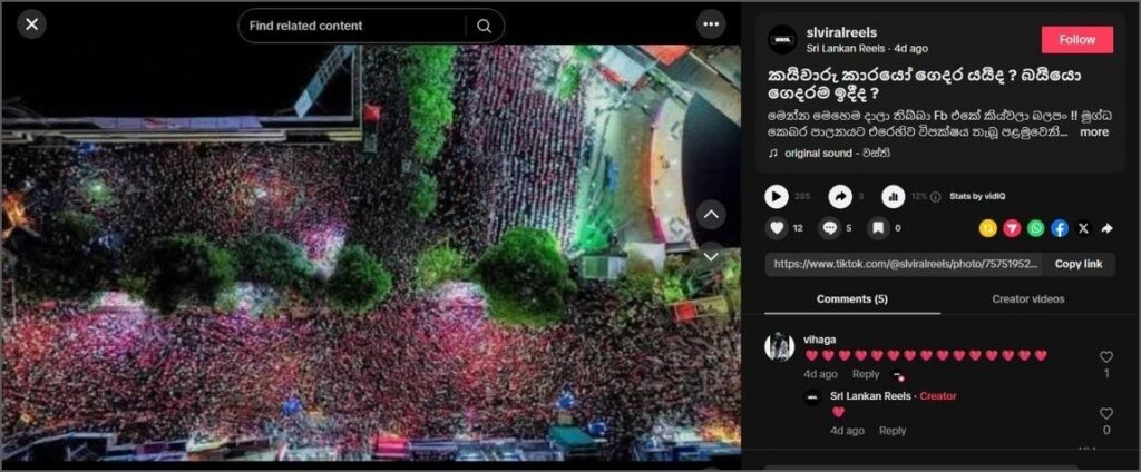 21 වන දා විපක්ෂ දේශපාලන කණ්ඩායම් විසින් සංවිධානය කර තිබූ රැලියේ ජායාරූප සහ ඩ්‍රෝන දර්ශන ලෙස දක්වා තිබූ ඉහත ජායාරූප ප්‍රධාන ධාරාවේ මාධ්‍ය විසින් වාර්තා කර නොතිබුණු බැවින් අප ඉහත ජායාරූප සහ ඩ්‍රෝන දර්ශන Reverse Image සෙවුමක් සඳහා යොමු කරනු ලැබුවා.