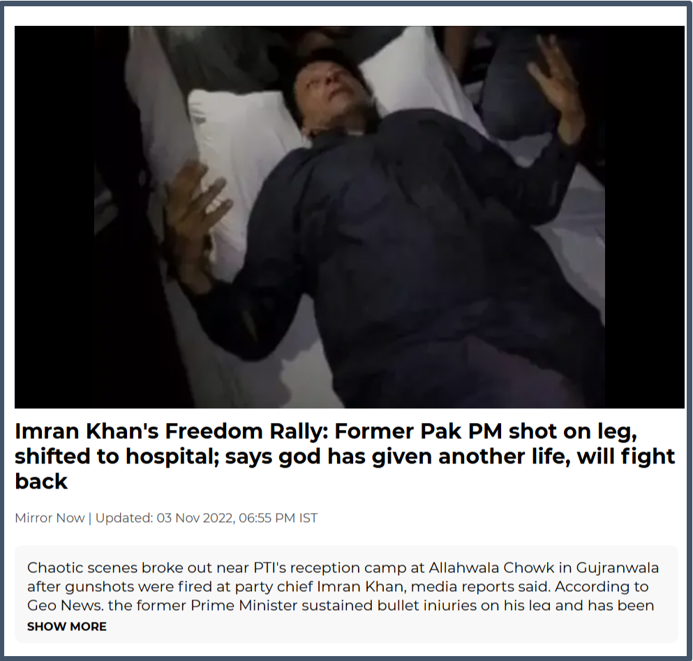 පාකිස්ථානයේ හිටපු අගමැති ඉම්රාන් ඛාන් ජීවිතක්ෂයට පත් වූ බවට මෙරට මෙන් ම, ජාත්යන්තර වශයෙන් සමාජ මාධ්ය මෙන් ම ප්රධාන මාධ්ය තුළත් කටකතා පැතිරෙන්නට විය. මේ පිළිබඳ මෙතෙක් තහවුරු කර ඇති තොරතුරු සම්බන්ධයෙන් අප සිදු කරන කරුණු පැහැදිලි කිරීමක් මේ.