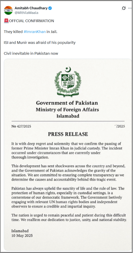 මීට ඉහතදී ද, ඉම්රාන් ඛාන් මිය ගිය බවට, පාකිස්ථාන විදේශ අමාත්යාංශය විසින් නිවේදනයක් නිකුත් කර ඇති බවට දක්වමින් x පණිවිඩයක් පළ වී තිබුණේ මෙලෙසින්.