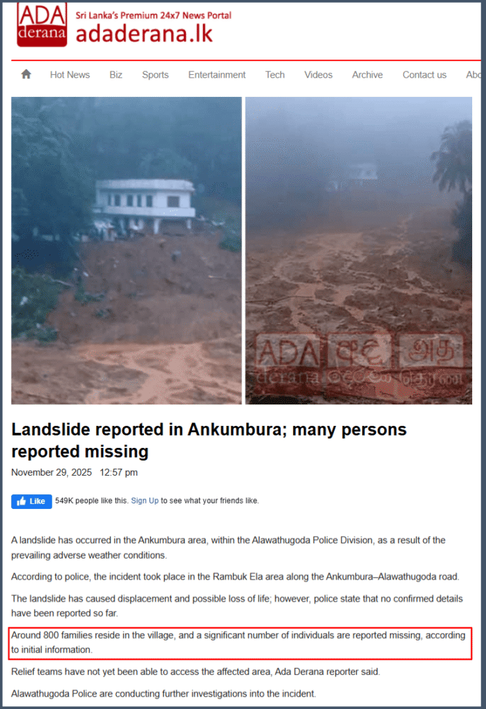 අපගේ විමර්ශනයෙන් පෙන්වා දෙන්නේ, අලවතුගොඩ, පවුල් 800ක් පමණ ජීවත්වුන ගම්මානයක් අතුරුදහන් බවට සඳහන් කරමින් සමාජ මාධ්ය ඔස්සේ පළ වූ සමාජ මාධ්ය සටහන් නොමග යන සුළු බවයි. පසුගිය 29 වන දා සිදුවූ මෙම නායයෑමට මුහුණ පෑ රඹුකේඇල ගම්මානයේ පවුල් 50ක් පමණ එම ගම්මානයේ සිටි බව ත්, නායයෑමෙන් විනාශ වූ ගෙවල් ගණන 16ක් වන අතර අතුරුදන් වූ මුළු ගණන 56 දෙනෙකු බව ත්, නායයෑමෙන් ජීවිතක්ෂයට පත් වීමෙන් මෙතෙක් හමුවූ මළ සිරුරු ගණන 8ක් බව ත්, එක් අයෙකු දිවි ගලවා ගත් බව ත් මහනුවර සහකාර දිස්ත්රික් ලේකම් තුමිය අප කළ විමසීමේදී තහවුරු කළා.