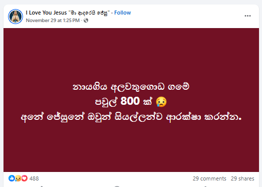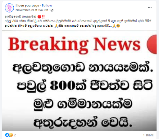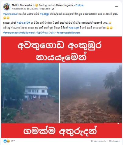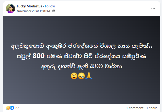 “අලවතුගොඩ, පවුල් 800ක් පමණ ජීවත්වුන ගම්මානයක් අතුරුදහන්!” යනුවෙන් සඳහන් කරමින් සමාජ මාධ්ය ඔස්සේ සටහනක් පළ වී තිබුණේ මේ අයුරින්.