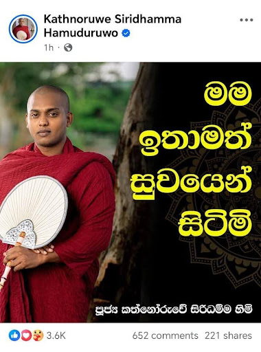 සිරිධම්ම හිමියන් ඉතාමත් සුවයෙන් සිටින බවට පෝස්ටුවක් සහ වීඩියෝවක් එම නිල ෆේස්බුක් පිටුවෙහි පල කර තිබුණා.