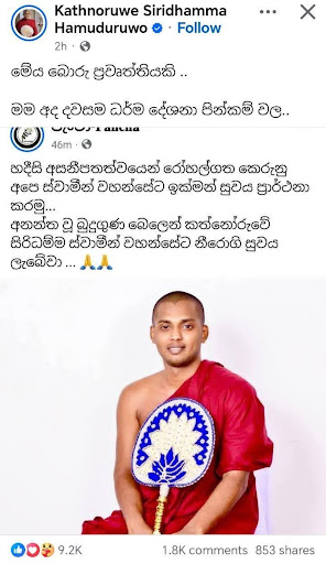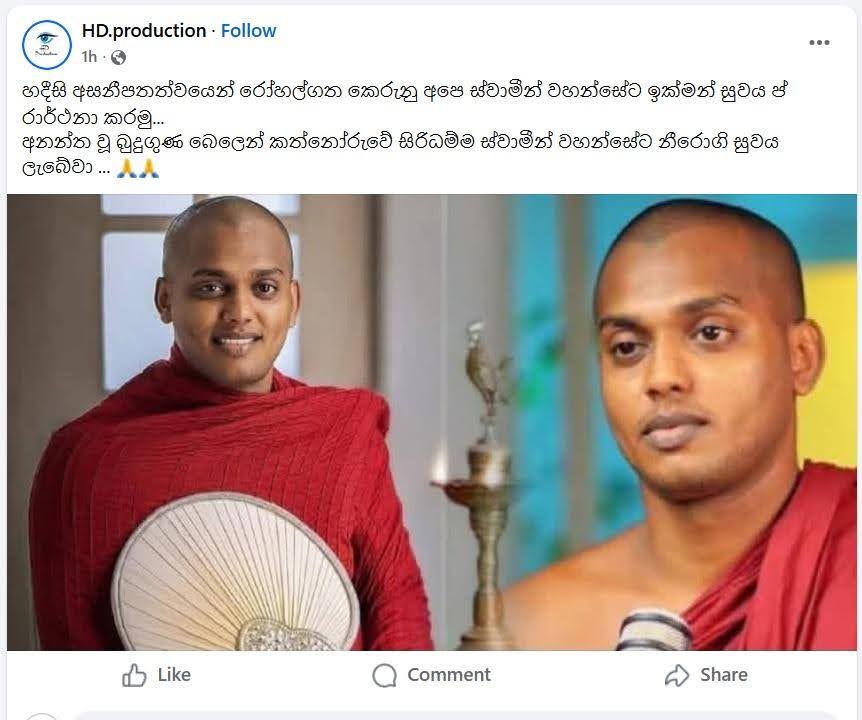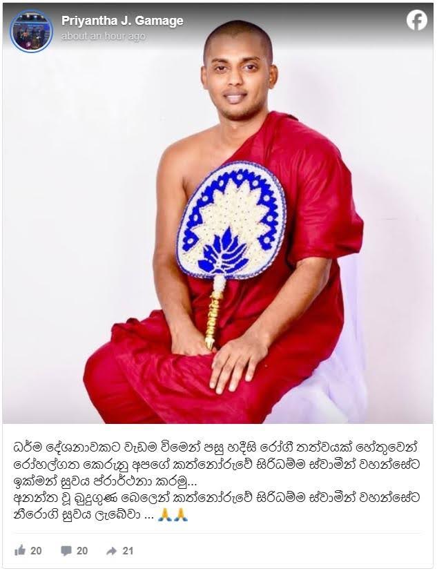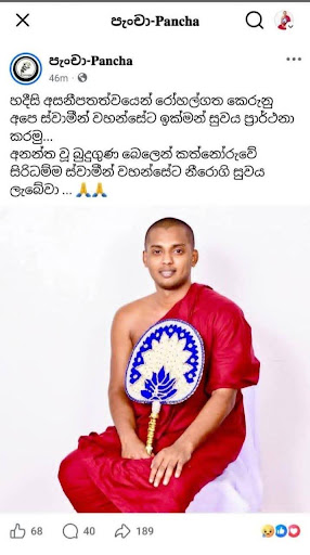 “හදිසි අසනීප තත්වයෙන් රෝහල් ගත කෙරුනු අපේ ස්වාමීන් වහන්සේර ඉක්මන් සුවය ප්රාර්ථනා කරමු…” යනුවෙන් සඳහන් කරමින් සමාජ මාධ්ය තුළ සටහන් පලවී තිබුණා.