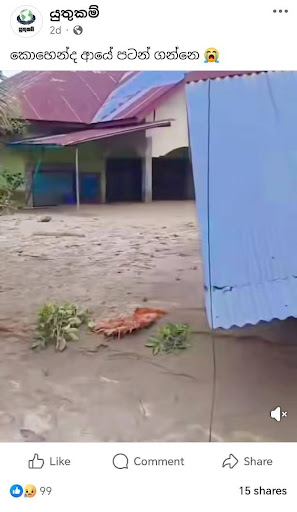 ශ්රී ලංකාවට බලපෑ ව්යසන තත්ත්වය සමඟ බොහෝ අසත්ය සහ නොමග යවන සුලු තොරතුරු සමාජ මාධ්ය තුළ සංසරණය වුණා. ඒ අතර මෙරටට බලපෑ ගංවතුර තත්වයේ වීඩියෝවක් ලෙසට සඳහන් කරමින්, නිවසක් එහි වහලය මට්ටම තෙක් මඩින් වැසී ගොස් ඇති ආකාරය දක්වන වීඩියෝ පටයක් සමාජ මාධ්ය තුළ බහුලව සංසරණය වුණා. ඒ සම්බන්ධයෙන් අප විසින් සිදු කළ කරුණු පරීක්ෂාවක් මේ,
