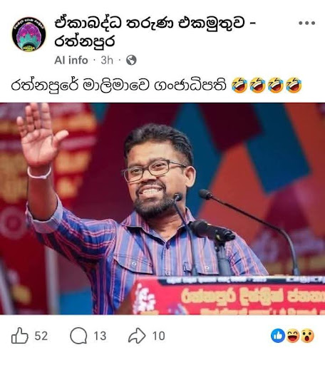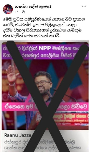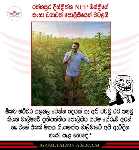 “රත්නපුර දිස්ත්රික් NPP මන්ත්රීගේ කංසා වගාවක් රත්නපුර පොලිසිය වටලයි” යනුවෙන් සඳහන් රත්නපුර දිස්ත්රික් පාර්ලිමේන්තු මන්ත්රී ශාන්ත පද්මකුමාර මහතාගේ ජායාරූපයක් සහිත සමාජ මාධ්ය සටහනක් අද (17) සමාජ මාධ්ය ඔස්සේ හුවමාරු වී තිබුණා. ජාතික ජන බලවේගය ඔස්සේ රත්නපුර දිස්ත්රික්කයෙන් පාර්ලිමේන්තුවට තරග වැදුණු, ජාතික ජන බලවේගයේ රත්නපුර දිස්ත්රික් පාර්ලිමේන්තු මන්ත්රී, ශාන්ත පද්මකුමාර මහතාගේ මැතිවරණ දැන්වීමක් ද මේ සමඟ පල කර තිබුණා.