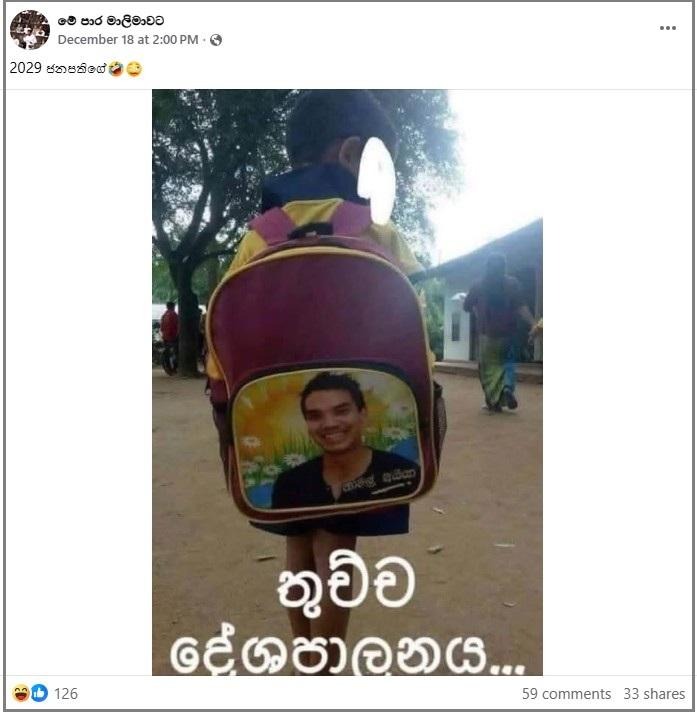 ‘2029 ජනපතිගේ’ යන තේමාවෙන් පසුගිය දෙසැම්බර් 18 වැනිදා පළ කර ඇති මෙම සටහන මගින් පෙන්වා දෙන්නේ මන්ත්රී නාමල් රාජපක්ෂගේ රුව සහිත බෑගයක්, කුඩා දරුවෙකු කරේ එල්ලා ගෙන සිටින ආකාරයක්.