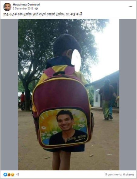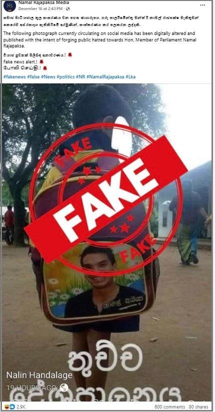 සමාජ මාධ්ය ඔස්සේ සංසරණය වන නාමල් රාජපක්ෂගේ රුව සහිත බෑගයක් එල්ලා ගෙන සිටින දරුවාගේ ඡායාරූපය සංස්කරණය කරන ලද ඡායාරූපයක් නොව, 2018 වසරේදී ඔහු විසින් දරුවන්ට ලබාදී ඇති සිය රුව සහිත පාසල් බෑගයක් බව අපට අනාවරණය විය.