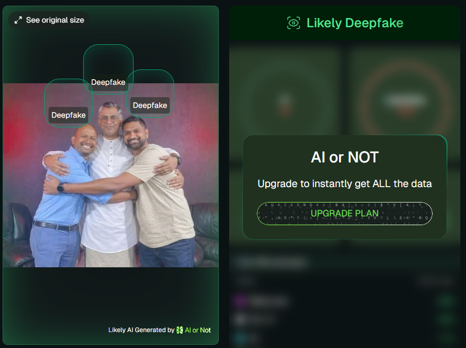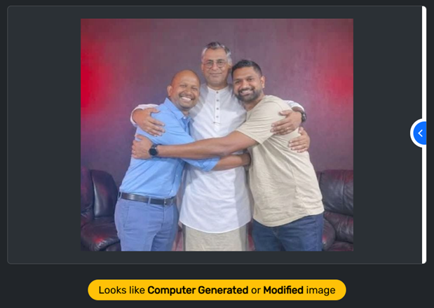 ඒ අනුව ඉරාජ් – මිලින්ද සහ පාඨලී චම්පික පෙනී සිටින ඡායාරූපයේ අස්වාභාවික පිහිටීම් හේතුවෙන් අප එම ඡායාරූපය සංස්කරණ කළ සහ AI ඔස්සේ සංස්කරණය කළ ඡායාරූප පරික්ෂා කරන මෙවලම් වෙත යොමු කිරීමට පියවර ගත්තා. ඒ අනුව පැහැදිලි වූයේ, මෙම ඡායාරූපය කෘත්රිම බුද්ධිය භාවිත කරමින් සංස්කරණය කරන ලද ඡායාරූපයක් බවයි.
